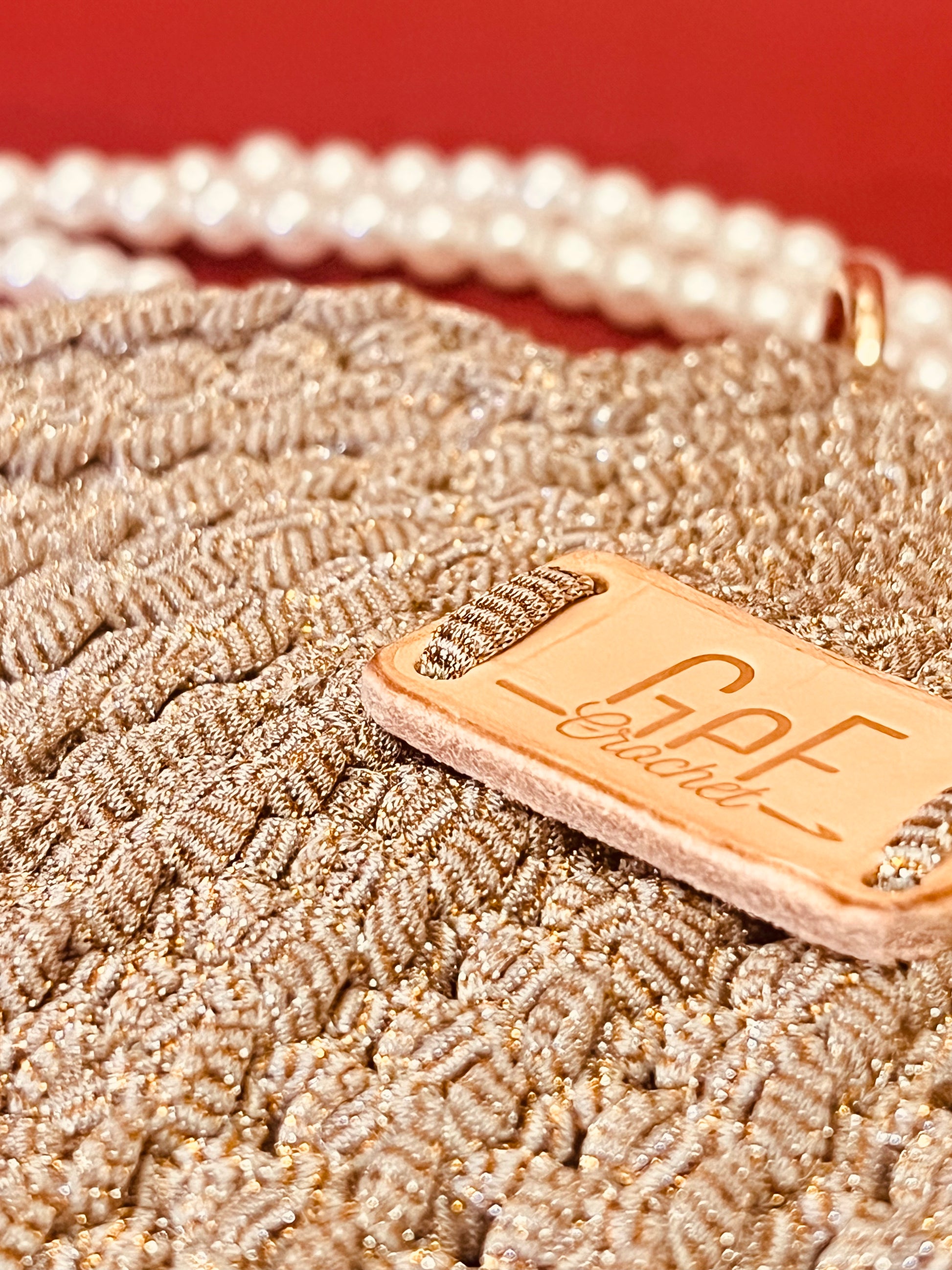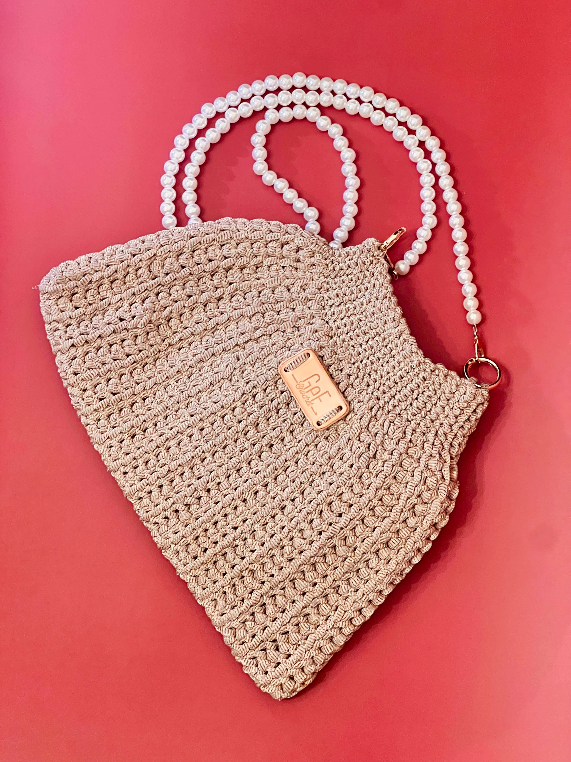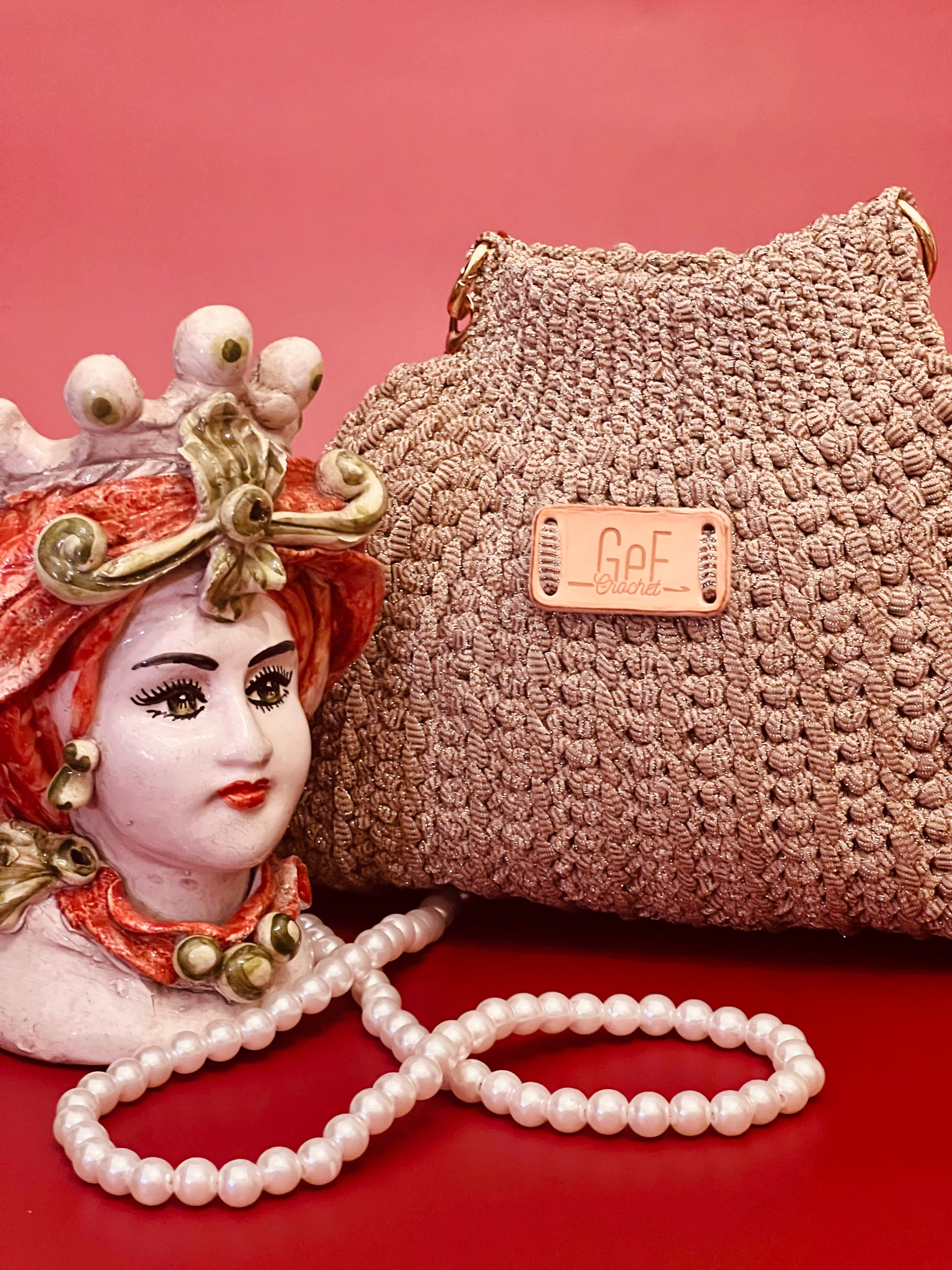 Interamente realizzata a mano all’uncinetto, si caratterizza per la sua linea morbida e pulita, impreziosita da una tracolla in perle che dona luce e personalità all’intero look.