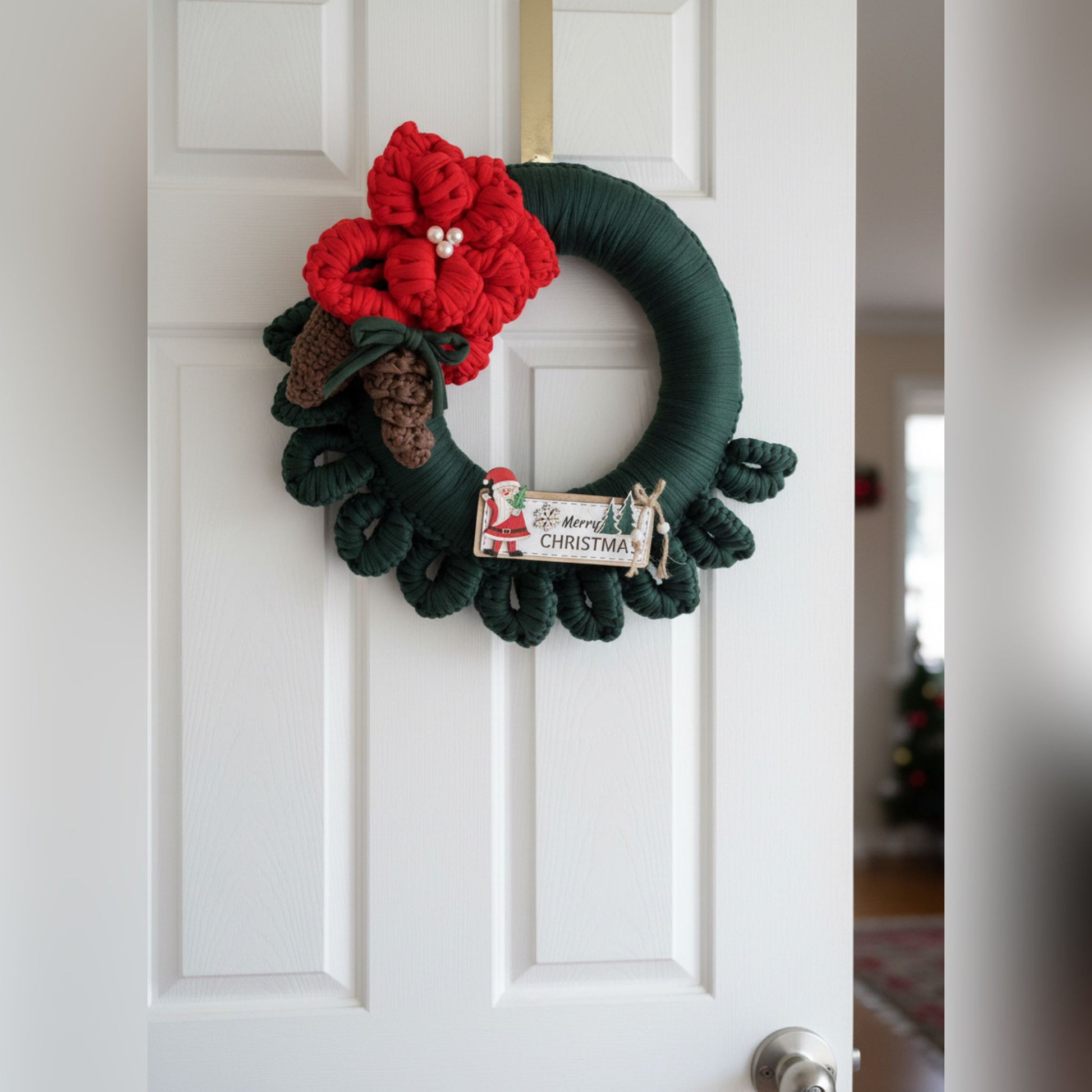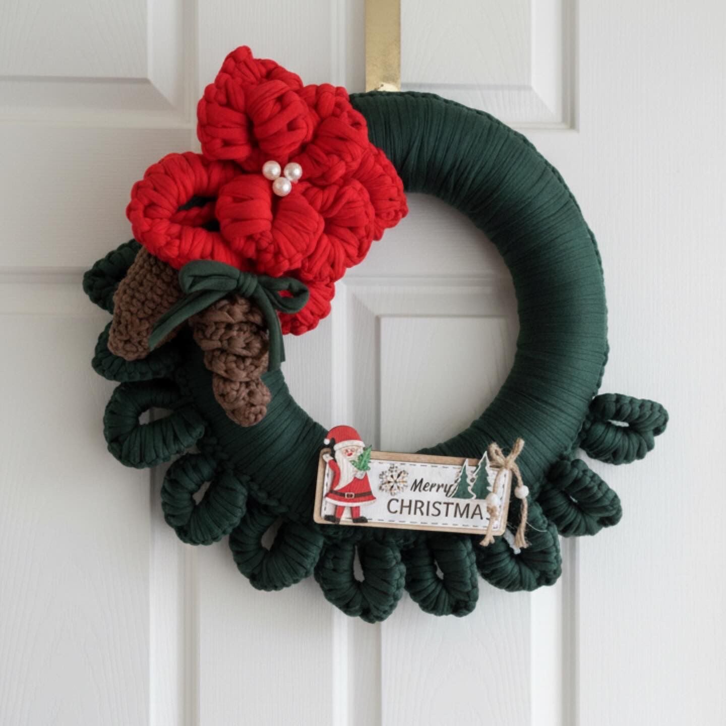 Ghirlanda natalizia perfetta per dare un tocco caldo e accogliente all’ingresso di casa. Realizzata con una base verde intensa, decorata con grande stella di Natale rossa, pigne e piccoli dettagli in legno, richiama subito l’atmosfera delle feste. Ogni ghirlanda è unica perché lavorata interamente a mano, ideale come decorazione per la porta o come idea regalo speciale per chi ama il Natale e i prodotti artigianali.