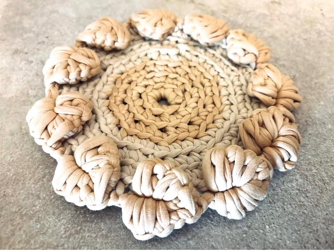 Questo è un sottopiatto o sottopentola dal look naturale e raffinato, lavorato a mano con filato in tonalità sabbia e beige che crea un delicato effetto degradé. La base tonda è compatta e resistente, mentre il bordo è decorato da piccoli “petali” in rilievo che ricordano una corolla di fiori, aggiungendo volume e movimento.