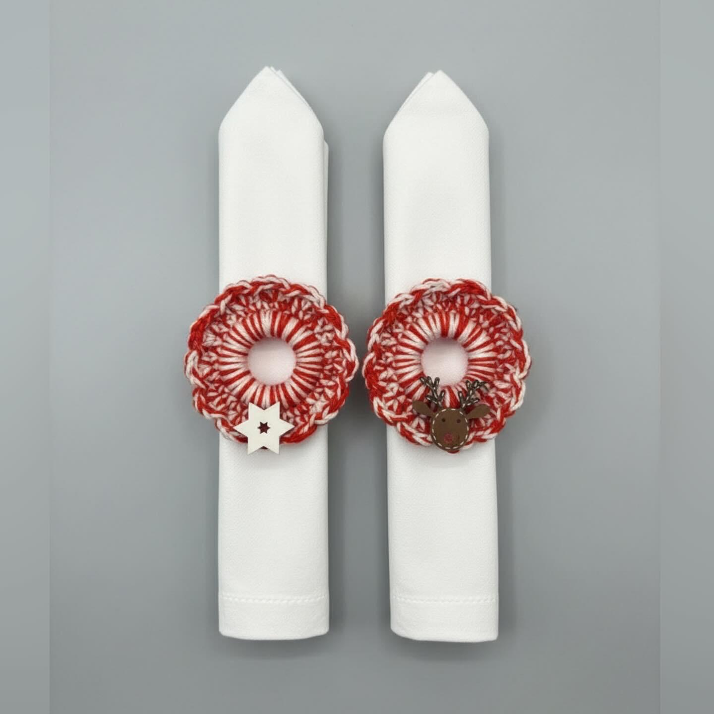 Portatovagliolo natalizio all’uncinetto a forma di piccola ghirlanda, realizzato a mano con filato bianco e rosso effetto Candy Cane perfetta per dare un tocco caldo e festoso alla tavola o alla casa. Ogni ghirlanda è rifinita con un’applicazione in legno a tema natalizio (renna o stellina) e può essere usata come segnaposto, portatovagliolo, mini decorazione per l’albero o dettaglio speciale per le confezioni regalo.