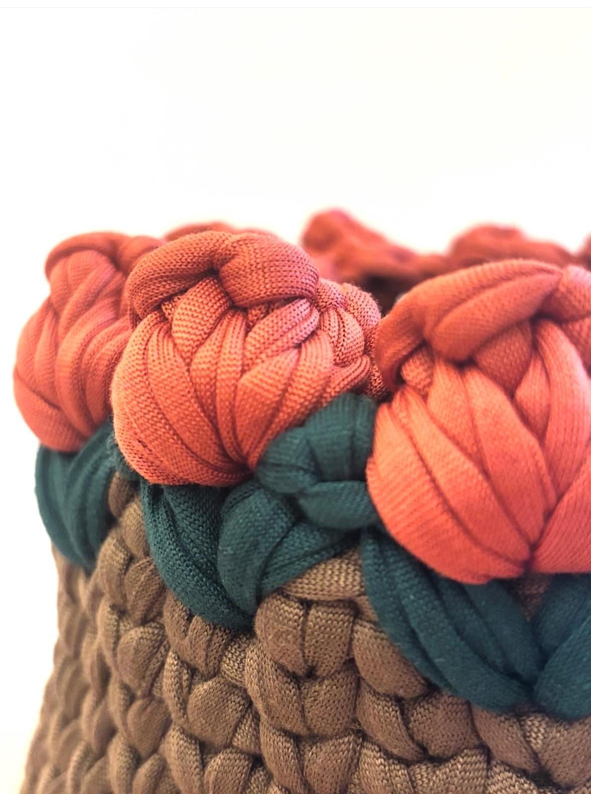 Cestino “Tulipani d’Autunno” , realizzato a mano con base color terra e bordo decorato da piccoli tulipani intrecciati nei toni del corallo e del verde bosco. La struttura compatta lo rende perfetto come svuotatasche, porta gioie, mini cachepot o piccolo contenitore decorativo per mensole e ingressi, aggiungendo un tocco caldo e naturale a qualsiasi ambiente.